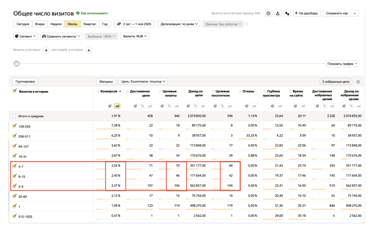 Нас интересуют количество визитов от 2-3 до 8-15, так как в выбранный промежуток времени у них больше всего целевых визитов (покупок), с высокой конверсией в покупку и при этом преимущественно с 1 покупкой, что смотрим в сравнении количества посетителей и визитов.