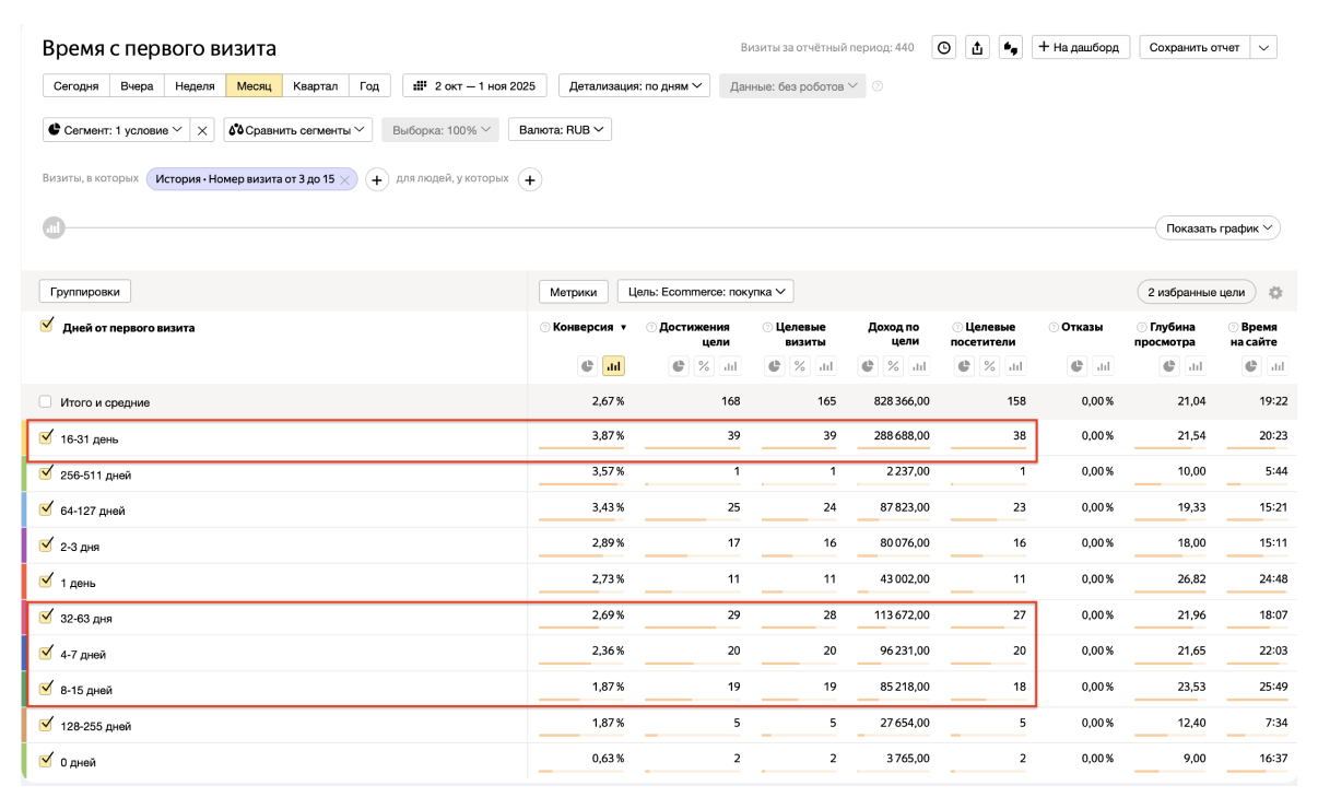 Рассмотрим еще другой пример. С одной из конференций Яндекса получил данные за март и апрель 2025 по времени от первого поиска до последней конверсии в медицинских клиниках.