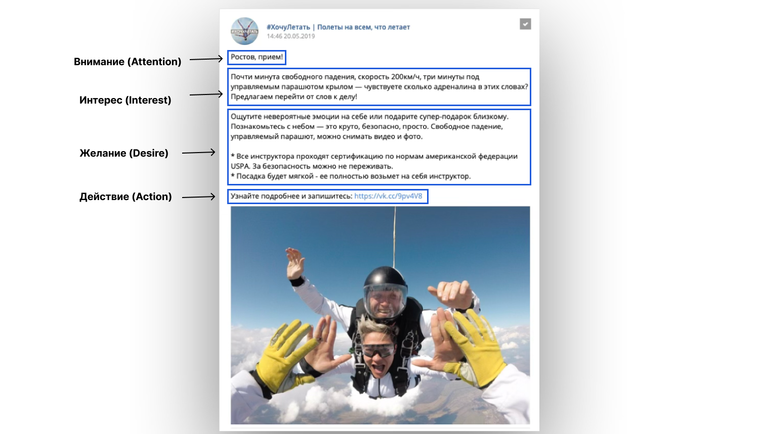 Добавлю только, что для бизнеса, который продает эмоции, например прыжки с парашютом, изначально писали более эмоциональный текст. Этого можно придерживаться.
