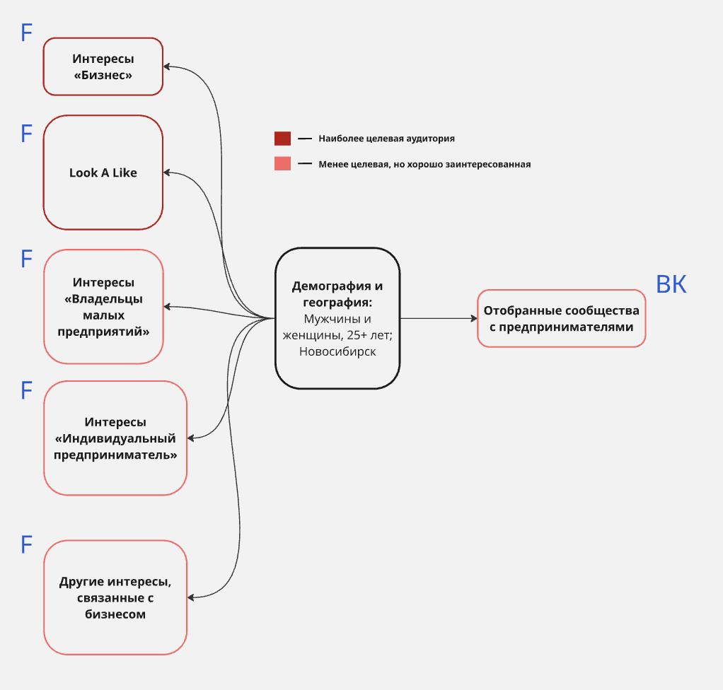 Во ВКонтакте размер аудитории была гораздо сильнее ограничена. Как по региону, так и по присутствию ЦА. Поэтому там запускали только по проверенным сообществам, где состоят предприниматели. Их ранее протестировали в других подобных проектах.
